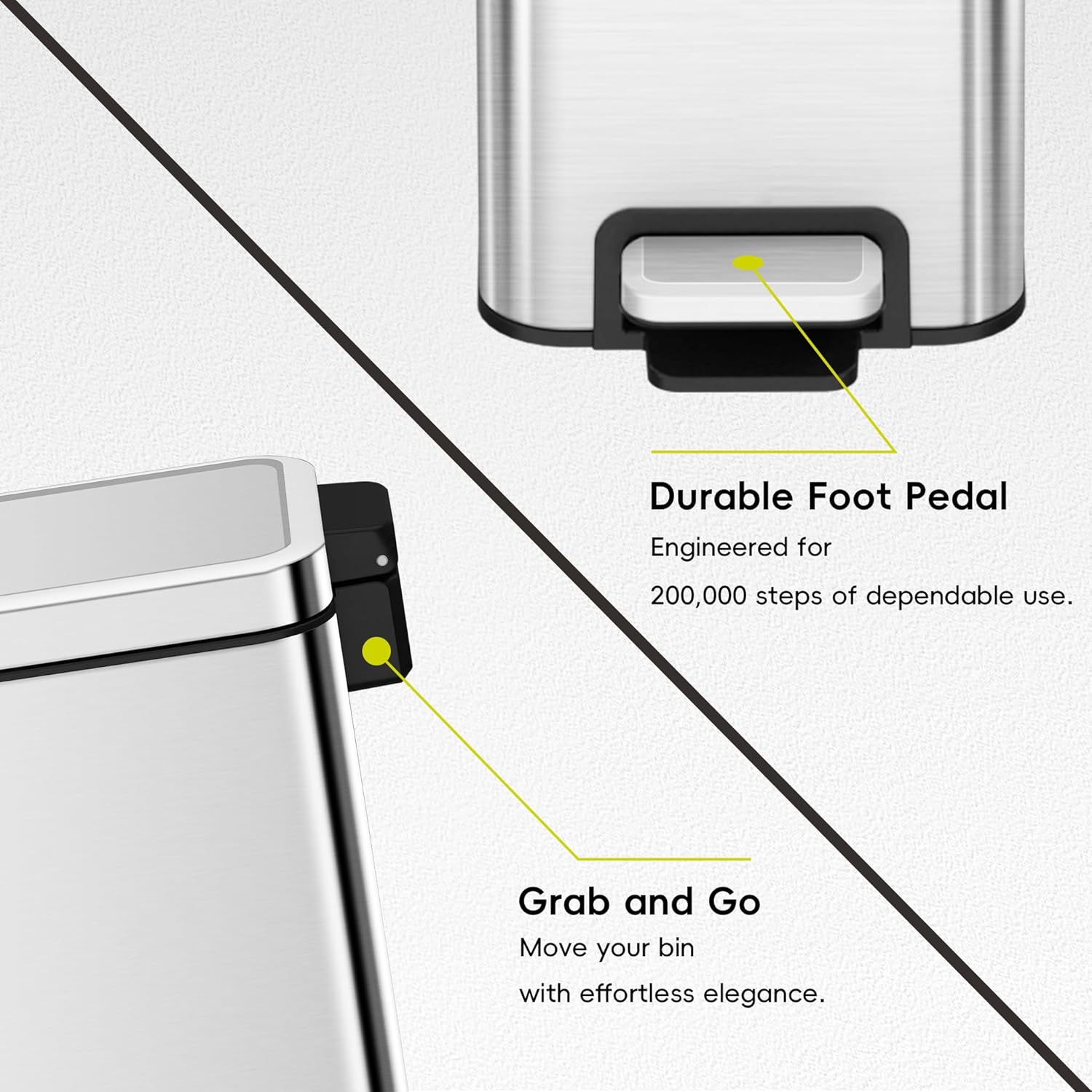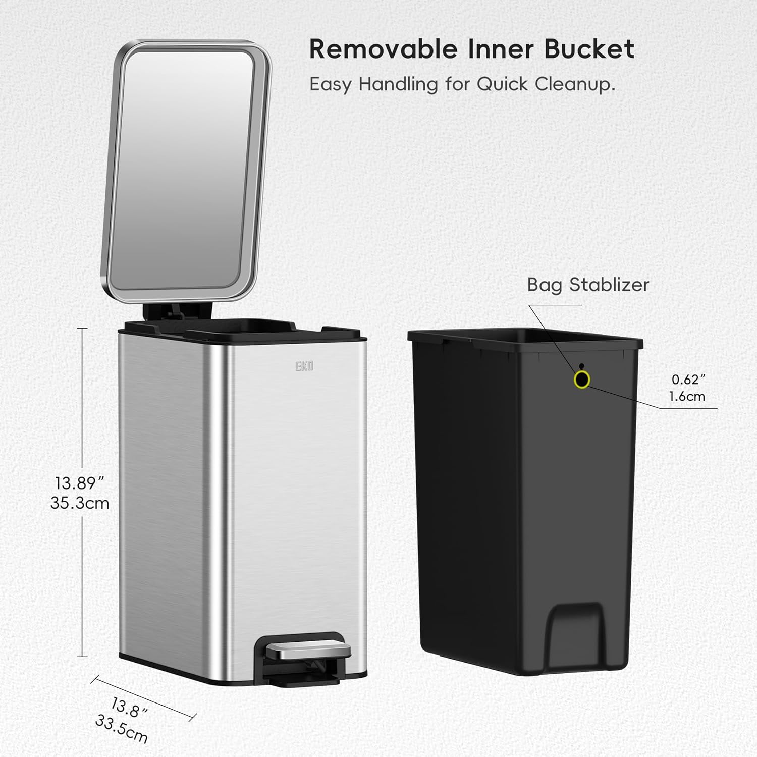 EKO Small Bathroom Trash Can with Lid Soft Close, Step Pedal, 10 Liter / 2.6 Gallon Stainless Steel Garbage Can with Removable Inner Bucket, Anti-Fingerprint Finish (Silver)