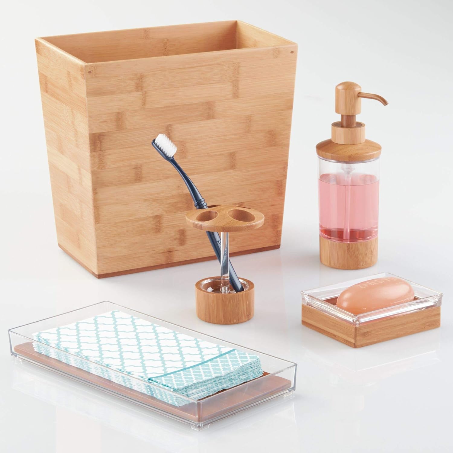 Designed with style and function in mind, the iDesign Formbu Bamboo Rectangular Waste Can provides convenient trash disposal wherever you need it. The versatile design makes it great for use as a trash can or recycling bin, and it can also be used to provide extra household storage basket space for cleaning supplies. The contemporary lines, rectangular shape, and natural wood finish add a touch of style to any room. The bath waste can is made with durable MDF with bamboo veneer to stand up to everyday use and is easy to clean with mild soap and water. This slim-profile wood trash bin measures 10.5" x 5.75" x 10" to fit into tight spaces in the bathroom, kitchen, bedroom, laundry room, office, dorm, and more. With iDesign you can LiveSimply every day.