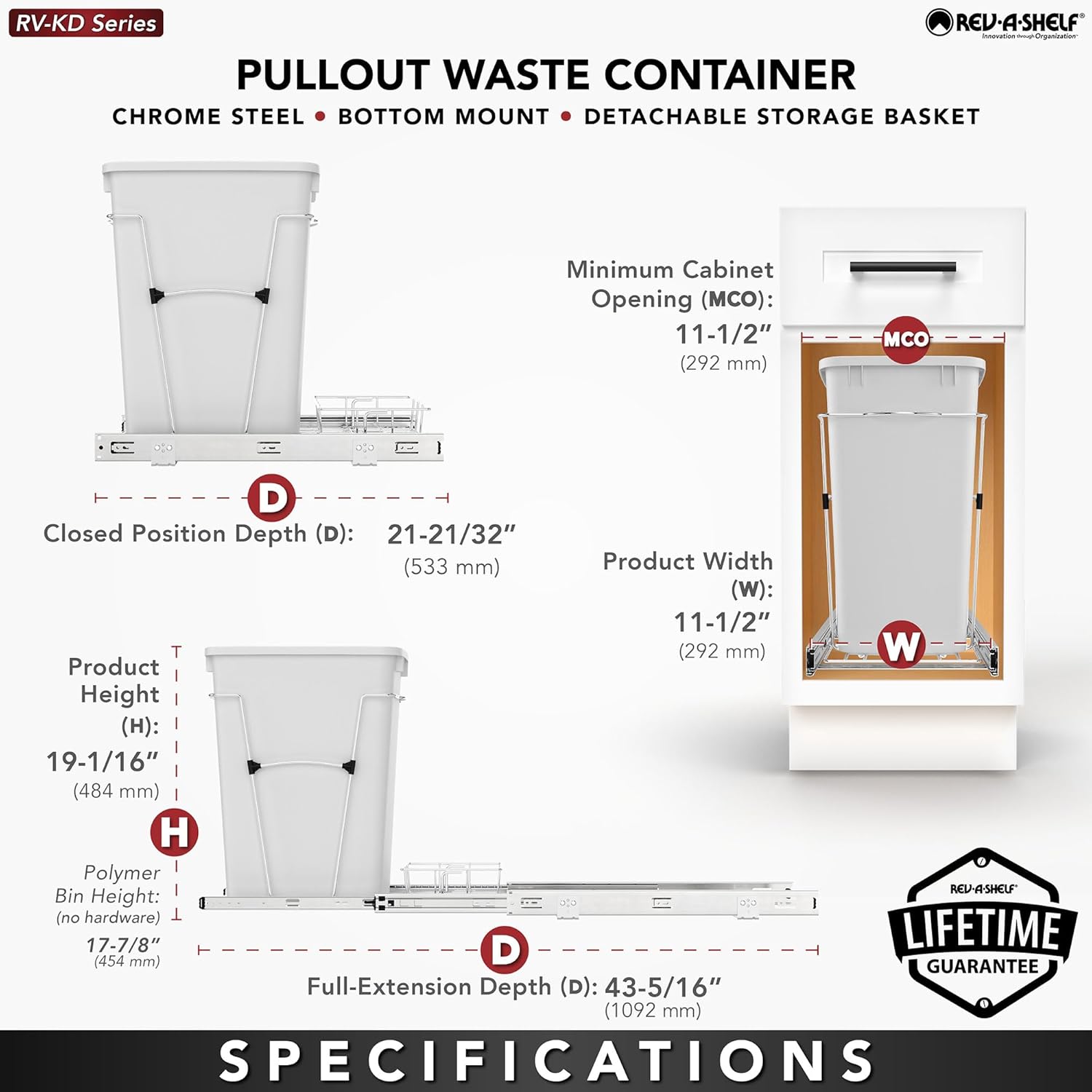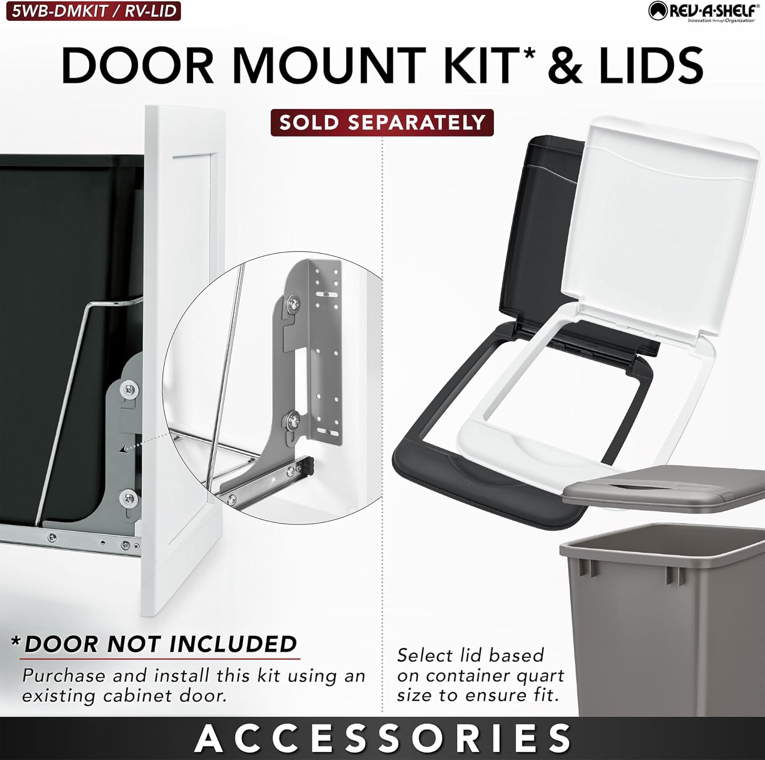 Rev-A-Shelf Pullout Trash Can for Kitchen Cabinets 35 Qt Garbage Waste Recycling Bin w/ Full Extension Slide, Metallic Silver, RV-12KD-17C S
